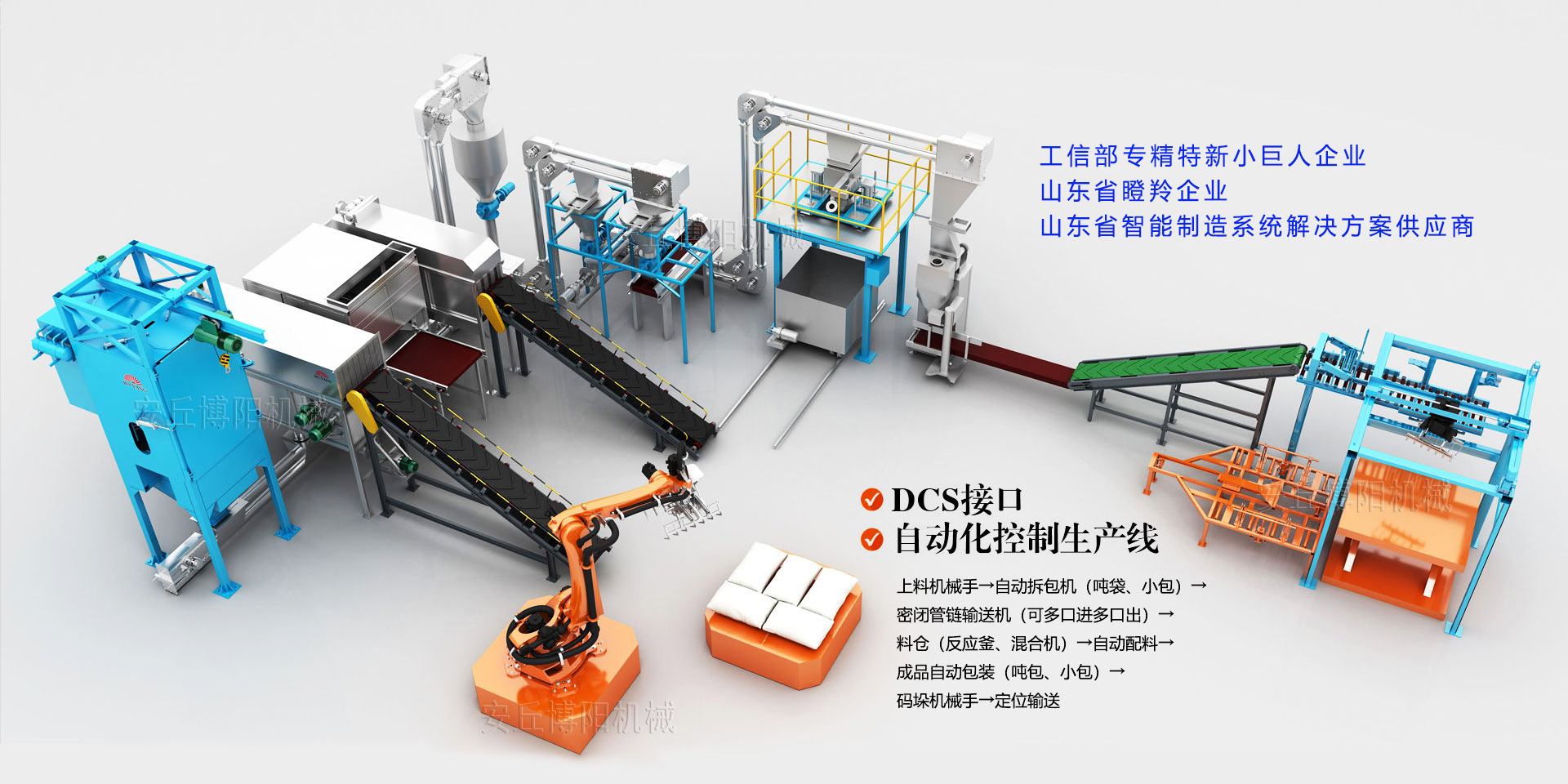 自動配料投料系統(tǒng)→全自動包裝機→碼垛機器人→AGV出入庫系統(tǒng)→自動裝車機生產(chǎn)線